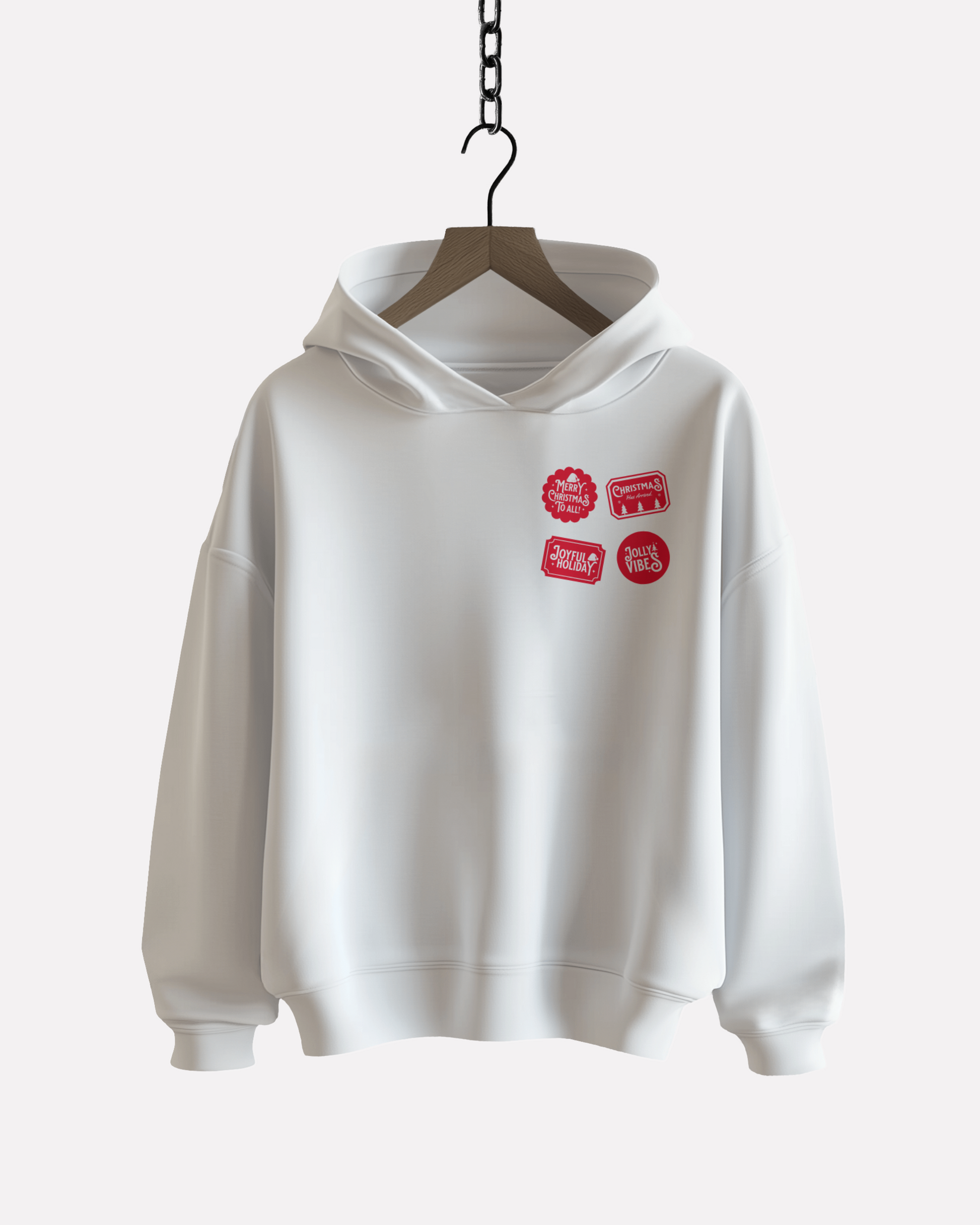 For those who love Christmas but prefer a minimalist touch — the Minimal Merry Hoodie is your go-to festive essential. Decorated with small, stylish red patches that say “Joyful Holiday,” “Jolly Vibes,” and “Merry Christmas to All,” it’s simple yet full of charm.